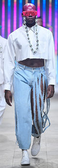 A mistura entre o chique e o esportivo vem de forma não forçada e a dualidade chega até aos acessórios, onde Igor propõe um suspensório que também pode ser usado como uma espécie de porta-skate nas costas.