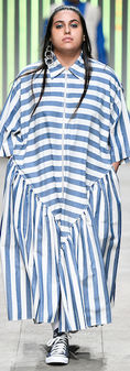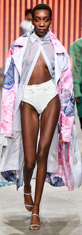 Misturando essa referências ao streetwear, constrói calças e saias clochard jeans em looks monocromáticos. Esse mix entre uma moda de rua e outra mais elegante é o ponto alto dessa coleção.
